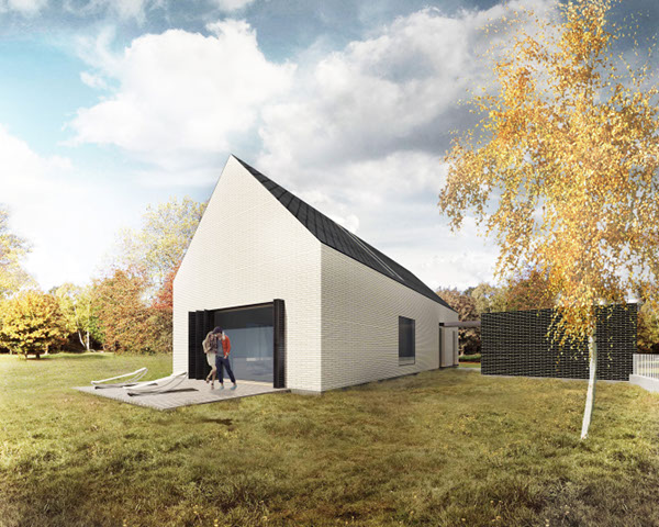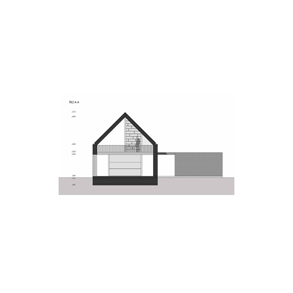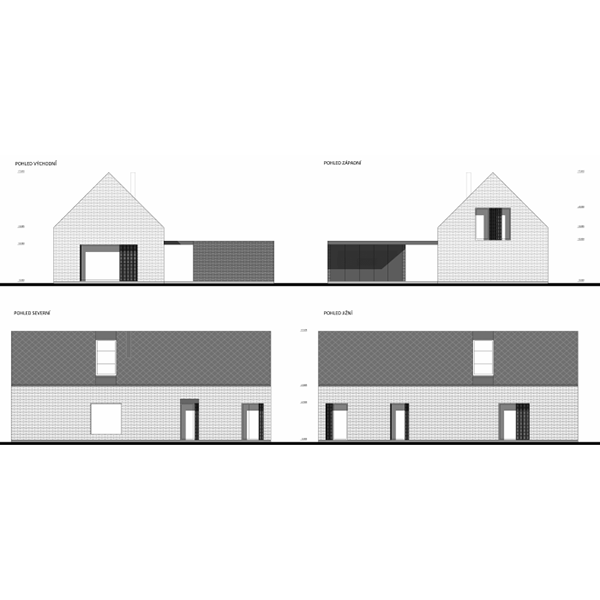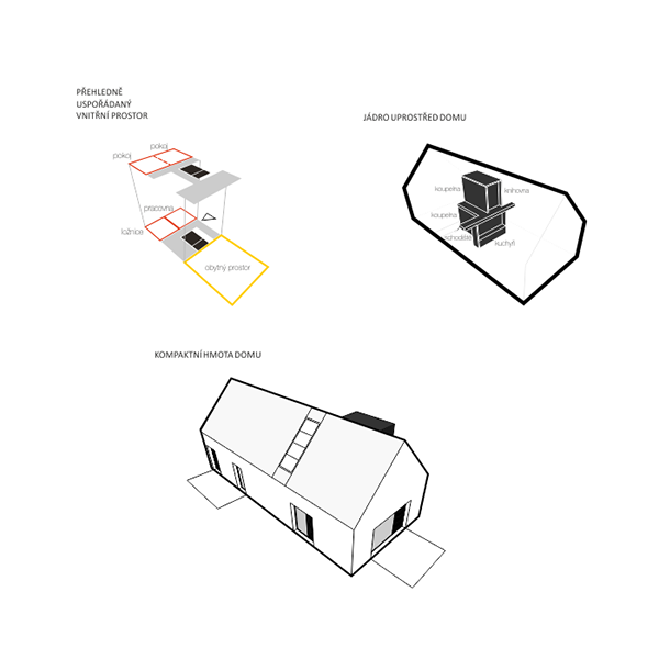 Návrh domu vychází z tradičního jednoduchého typu domu se sedlovou střechou. Dům se jeví navenek nenápadně a harmonicky zapadá do svého okolí. Není mu kontrastem, ale naopak hledá tradici místa, do kterého chce zapadnout. Jednoduchá hmota domu doplněná o garážové stání zcela přirozeně definuje vstupní a soukromou část pozemku a vytváří tak jasný, přátelský prostor pro své obyvatele.