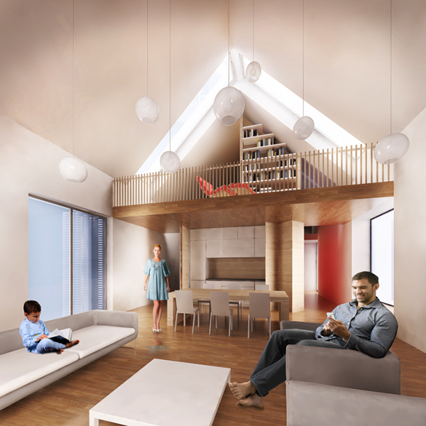 Netradiční je však řešení interiéru. Jednotlivé místnosti domu byly rozděleny dle svého významu a účelu na část soukromou a společnou. Mezi tyto dvě části bylo vloženo centrální komunikační jádro, které má výhradně užitnou funkci, a zároveň dodává domu na originalitě. Uplatněním rozdílných výšek místností bylo dosaženo pocitu neobyčejného prostoru. Důraz byl však kladen i na útulnost a dosažení pocitu domova. Centrální obytný prostor byl oproti klasickému modelu rodinných domů rozšířen ve všech směrech tak aby navozoval pocit přirozeného těžiště obydlí, kde se může celá rodina sejít a trávit tak spolu drahocenné chvíle pohody. Na tento obytný prostor navazuje v horním patře obytná galerie s knihovnou, popřípadě hernou dětí. Důraz byl kladen také na velkou míru variability dětských pokojů, kde je možné pomocí posuvné stěny reagovat na požadavky dětí. Ložnice je umístěna v přízemí spolu s pracovnou, obě místnosti mají přímý východ do zahrady, aby byla dosažena maximální možná míra komfortu bydlení v rodinném domě a to sice kontaktu s přírodou.