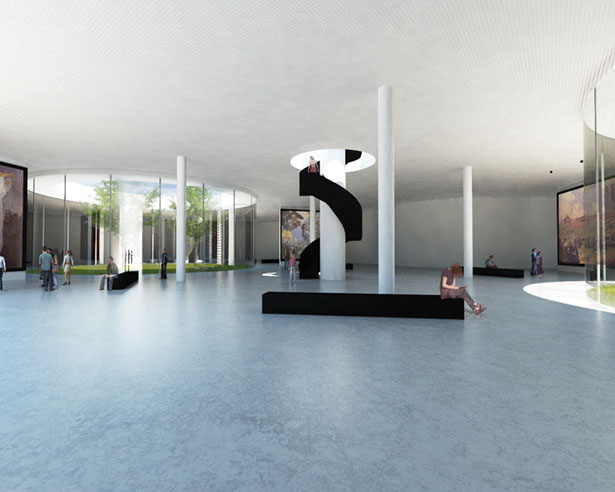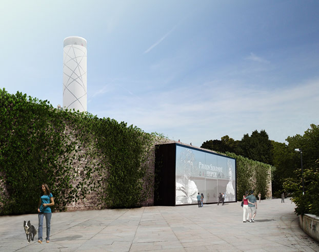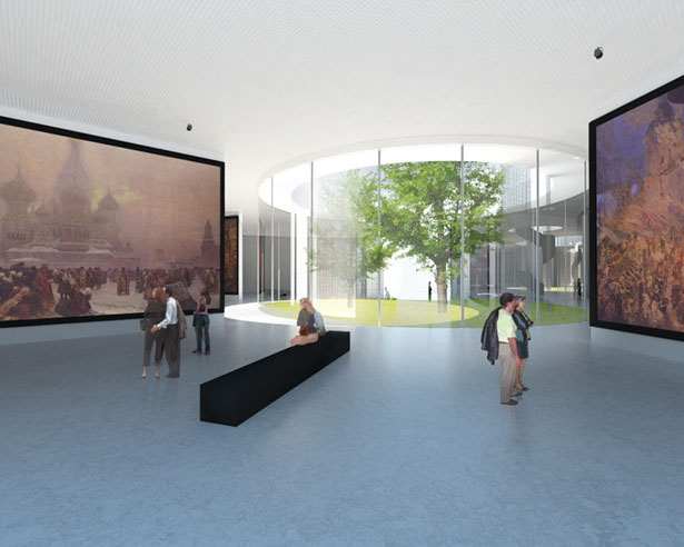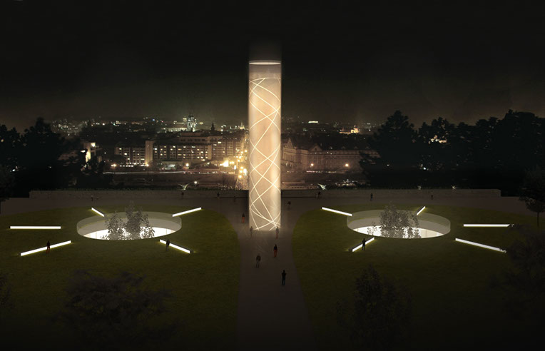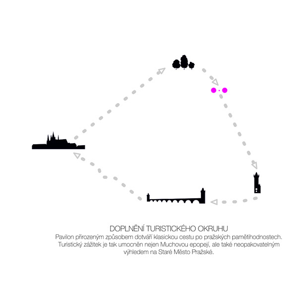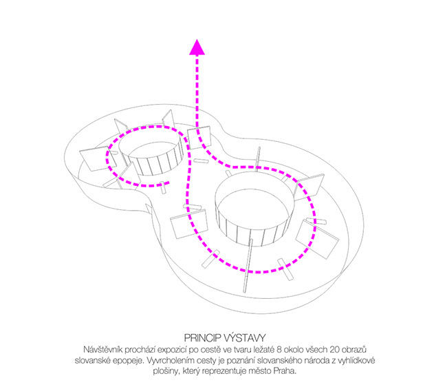 Pavilon Slovanské epopeje umisťujeme na Letnou do místa bývalého Stalinova památníku. Toto významné místo nejen v rámci Prahy, ale i v rámci historie českého národa je v současné době zanedbané a čeká na důstojné využití. Nejsme však toho názoru, že je na toto místo nutné umístit monument podobně, jak učinili komunisté v polovině minulého století. Muchova Slovanská epopej je sama o sobě tak významné dílo, že jakákoliv snaha upozornit na její jedinečnost mimořádnou stavbou by ji jen uškodila a vytvářela by ji konkurenci. Přistupujeme tedy k návrhu s pokorou jak k městu, tak k epopeji. Chceme navázat na kompoziční řád města a tak umisťujeme pavilon na vrchol pohledové osy vedené směrem ze Staroměstského Náměstí ulicí Pařížskou. Nechceme přetvářet siluetu Letné novou dominantou a tak umisťujeme hlavní hmotu stavby pod zem. Zvolené řešení tak jednoduše dotváří městský prostor, obrací se vstupem směrem k městu a z druhé strany, z Letenských sadů navazuje na park a vytváří vyhlídku s nádherným panoramatem Starého Města.