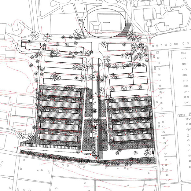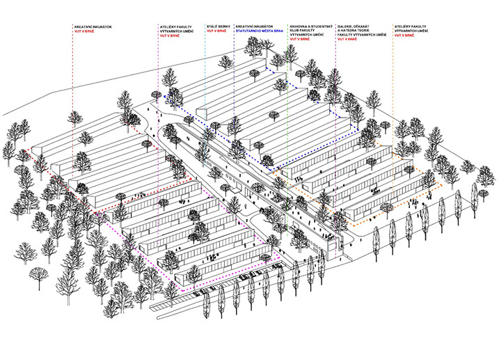 Předmětem překládané studie je vyřešení umístění všech provozů a atelierů FAVU VUT na východním svahu Kraví Hory v prostoru vymezeném souborem provizorních objektů VUT, celkem 13+2 a celkem 5 objektů města Brna.