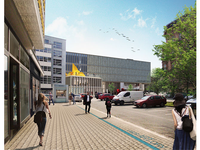 Masivní a solidní výraz diagonální hmoty galerie je výrazem jasného a čistého veřejného charakteru stavby orientovaného k městu. Galerie nad městem tak povyšuje význam za hranice parcely. V plynulém zakončení rytmické řady aleje tř. Kpt. Jaroše začíná stavba nízkou hmotou, pokračuje hlavním prostorem galerie-nesmělé diagonály a je zakončena doplněním bloku Koliště věžovým charakterem umělecké knihovny. Dojem levitace galerie nad městem je umocněn prosklením v parteru umístěného sálu s možností otevření se dění ve městě. Oživením městského parteru se posílí společenský význam stavby. Řešení fasády předsazeným betonovým roštem je definována plnost hmoty, či otevřenost prosklením jako obrazovka do města. Předsálí orientované prosklením nad alej tř. Kpt. Jaroše či velkoformátové liniové prosklení nároží orientované na Moravské náměstí.