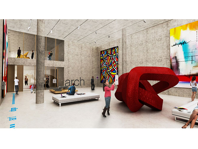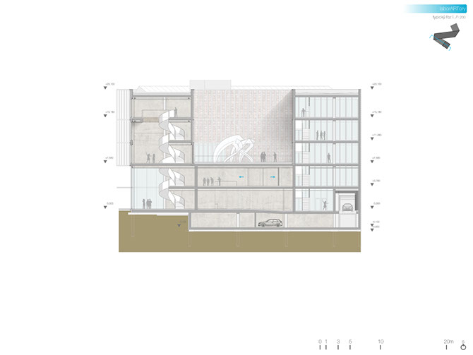 Snahou bylo vytvoření galerie města, spíše než galerie ve městě. Tomu odpovídá orientace a hmota hlavního objemu stavby, diagonály hmotného „špalku“ levitujícího nad městem. Symbol vytříbenosti a jasného veřejného charakteru stavby. Galerijní prostor je orientován k městu jako symbolické vtažení městského života do galerie, čemuž odpovídá i umístění hlavního vstupu do exponovaného nároží. Volné výstavy, vernisáže a společenské události města se prostřednictvím prosklení a možnosti otevření do uličního parteru stanou veřejným městským děním otevřeným veškerým obyvatelům Brna.