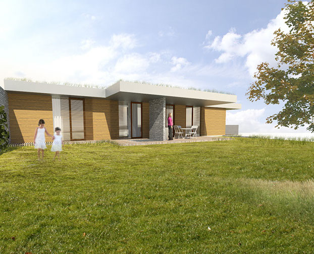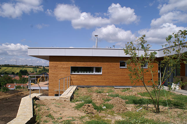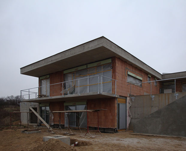 Rodinný dům je koncipován jako dvoupodlažní, využívá konfigurace terénu, který se svažuje k jihu a výškový rozdíl je jedno podlaží. Dům je postaven záměrně napříč vrstevnic, je posazený kolmo na stávající svah. Proto obě podlaží mohou využívat přímého spojení s okolním terénem. Dům má tedy v zásadě orientaci východ, západ.