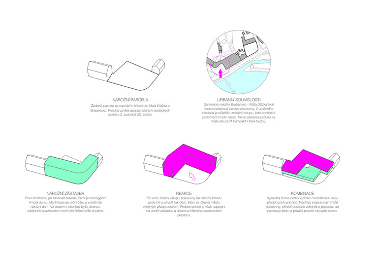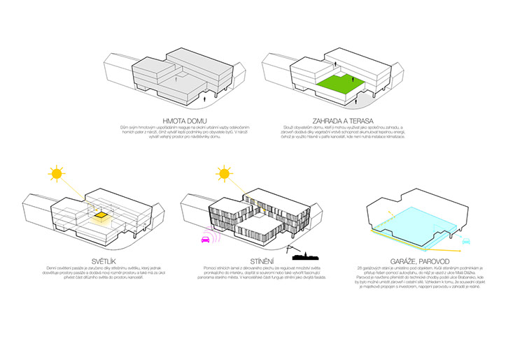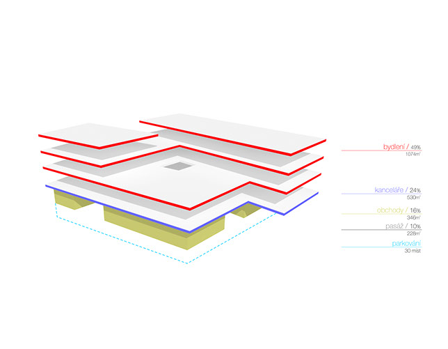 Čtyřpodlažní hmota polyfunkčního domu je definována dvěma odlišnými principy. První tvoří 1. a 2.NP zástavbou do nároží podél uliční čáry. Druhý naopak prolamuje hmotu a odsouvá 3. a 4. podlaží k zadní hranici parcely. Tato kombinace protichůdných forem vytváří zajímavé prostorové podmínky pro rozdílné funkce obsažené v domě. V 1.NP nalezneme převýšenou vnitřní pasáž s částečným vrchním osvětlením. Na tento prostor úzce navazují obchody v přízemí a v 2.NP kanceláře. Uskočení horních bytových podlaží vytváří nad kancelářským patrem vnější terasu s vegetační střechou. Ta má dvojí využití. Jednak akumuluje teplo a dodává příjemnější klima kancelářím a také slouží obyvatelům bytů jako společná zahrada. Tento prvek tak propojuje obyvatele domu, čímž má za cíl vytvořit nejen prostor pro bydlení, ale i dobré podmínky pro vznik sousedské komunity. V dvou horních patrech domu jsou umístěny převážně malometrážní byty. Ty jsou provozně napojeny na vnější pavlač. Toto uspořádání dovoluje jistou míru variability dispozic pomocí slučování jednotlivých buněk vždy po ½ modulové osnovy domu.