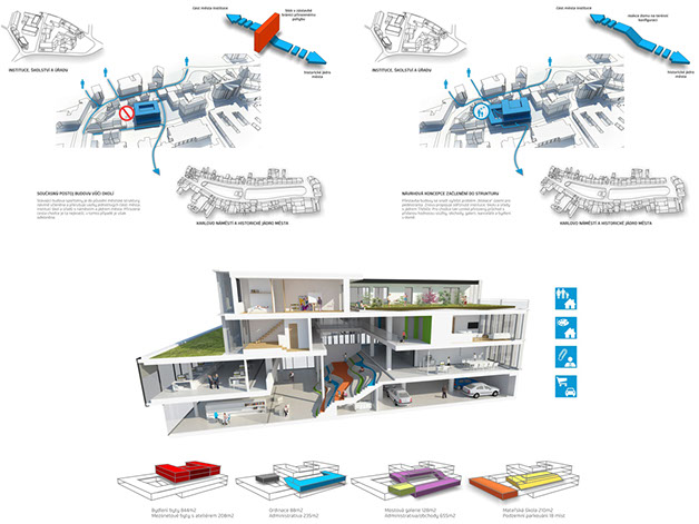 Hlavním cílem této práce bylo z nevyužité budovy bývalé spořitelny vytvořit fungující městský prvek, který by správně reagoval na potřeby obyvatel města. Navržen byl polyfunkční městský dům s odpovídajícím typem bydlení a široce využitelnými prostory pro služby, administrativu a komerci. Budova se nachází v těsné blízkosti historického jádra města při ulici Soukopova v bývalém okruhu středověkých hradeb. Součástí projektu bylo řešení blízkých urbánních vztahů, především dle návrhu územního plánu, vytvoření pěšího průchodu lokalitou a vyřešení problematiky parkování v dané lokalitě. Rezidenti nově vytvořeného bydlení mají parkování zajištěné v suterénní části domu. Vzhledem k rekonstrukci by bylo neefektivní zvětšovat kapacitu parkování v domě o plochy pro provoz přilehlé komerce a nově vytvořených služeb. Zároveň by tak došlo ke zvýšení dopravní frekvence v ulici Soukopova, která je stísněně formovaná historickým vývojem města. Z toho důvodu je také jednosměrná. Další parkovací plochy jsou tedy naplněny stáními na terénu (západně od budovy) a v plánovaném parkovacím domě na nároží ulice Bedřicha Václavka a Sirotčí.
