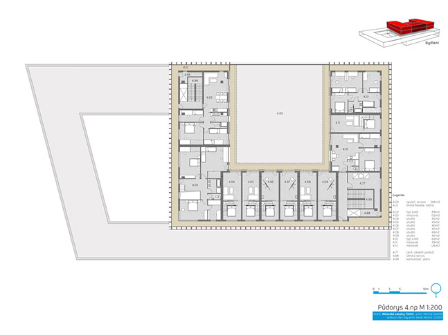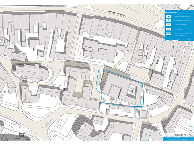 Nově navržená hmota tak v plné míře respektuje přirozené cesty pedestrantů procházejících územím. Oproti původní koncepci se dům chodcům do cesty nestaví, ale naopak jim jejich cestu otvírá a navíc vytváří přidanou hodnotu při průchodu prostřednictvím nově vytvořených ploch obchodu a služeb. Koncept tak plně respektuje návrhovou situaci územního plánu kde je počítáno s pěším průchodem skrz hradby z ulice Bedřicha Václavka.