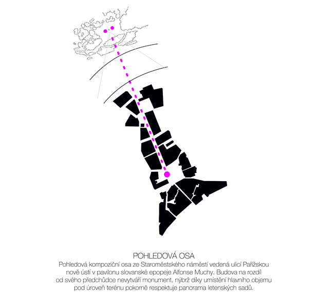 Pavilon Slovanské epopeje umisťujeme na Letnou do místa bývalého Stalinova památníku. Toto významné místo nejen v rámci Prahy, ale i v rámci historie českého národa je v současné době zanedbané a čeká na důstojné využití. Nejsme však toho názoru, že je na toto místo nutné umístit monument podobně, jak učinili komunisté v polovině minulého století. Muchova Slovanská epopej je sama o sobě tak významné dílo, že jakákoliv snaha upozornit na její jedinečnost mimořádnou stavbou by ji jen uškodila a vytvářela by ji konkurenci. Přistupujeme tedy k návrhu s pokorou jak k městu, tak k epopeji. Chceme navázat na kompoziční řád města a tak umisťujeme pavilon na vrchol pohledové osy vedené směrem ze Staroměstského Náměstí ulicí Pařížskou. Nechceme přetvářet siluetu Letné novou dominantou a tak umisťujeme hlavní hmotu stavby pod zem. Zvolené řešení tak jednoduše dotváří městský prostor, obrací se vstupem směrem k městu a z druhé strany, z Letenských sadů navazuje na park a vytváří vyhlídku s nádherným panoramatem Starého Města.