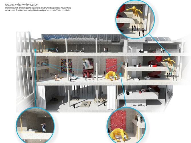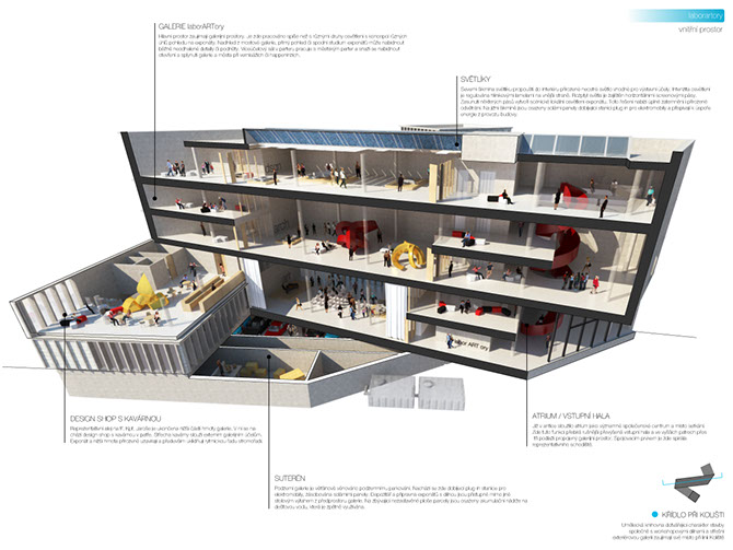 Snahou bylo vytvoření galerie města, spíše než galerie ve městě. Tomu odpovídá orientace a hmota hlavního objemu stavby, diagonály hmotného „špalku“ levitujícího nad městem. Symbol vytříbenosti a jasného veřejného charakteru stavby. Galerijní prostor je orientován k městu jako symbolické vtažení městského života do galerie, čemuž odpovídá i umístění hlavního vstupu do exponovaného nároží. Volné výstavy, vernisáže a společenské události města se prostřednictvím prosklení a možnosti otevření do uličního parteru stanou veřejným městským děním otevřeným veškerým obyvatelům Brna.