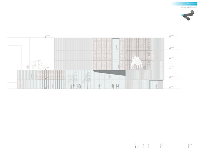 Masivní a solidní výraz diagonální hmoty galerie je výrazem jasného a čistého veřejného charakteru stavby orientovaného k městu. Galerie nad městem tak povyšuje význam za hranice parcely. V plynulém zakončení rytmické řady aleje tř. Kpt. Jaroše začíná stavba nízkou hmotou, pokračuje hlavním prostorem galerie-nesmělé diagonály a je zakončena doplněním bloku Koliště věžovým charakterem umělecké knihovny. Dojem levitace galerie nad městem je umocněn prosklením v parteru umístěného sálu s možností otevření se dění ve městě. Oživením městského parteru se posílí společenský význam stavby. Řešení fasády předsazeným betonovým roštem je definována plnost hmoty, či otevřenost prosklením jako obrazovka do města. Předsálí orientované prosklením nad alej tř. Kpt. Jaroše či velkoformátové liniové prosklení nároží orientované na Moravské náměstí.