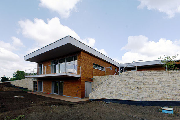 Rodinný dům je koncipován jako dvoupodlažní, využívá konfigurace terénu, který se svažuje k jihu a výškový rozdíl je jedno podlaží. Dům je postaven záměrně napříč vrstevnic, je posazený kolmo na stávající svah. Proto obě podlaží mohou využívat přímého spojení s okolním terénem. Dům má tedy v zásadě orientaci východ, západ.