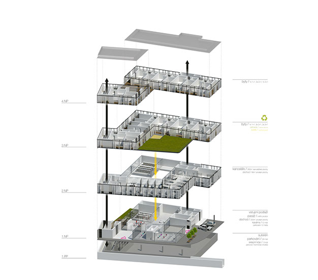 Čtyřpodlažní hmota polyfunkčního domu je definována dvěma odlišnými principy. První tvoří 1. a 2.NP zástavbou do nároží podél uliční čáry. Druhý naopak prolamuje hmotu a odsouvá 3. a 4. podlaží k zadní hranici parcely. Tato kombinace protichůdných forem vytváří zajímavé prostorové podmínky pro rozdílné funkce obsažené v domě. V 1.NP nalezneme převýšenou vnitřní pasáž s částečným vrchním osvětlením. Na tento prostor úzce navazují obchody v přízemí a v 2.NP kanceláře. Uskočení horních bytových podlaží vytváří nad kancelářským patrem vnější terasu s vegetační střechou. Ta má dvojí využití. Jednak akumuluje teplo a dodává příjemnější klima kancelářím a také slouží obyvatelům bytů jako společná zahrada. Tento prvek tak propojuje obyvatele domu, čímž má za cíl vytvořit nejen prostor pro bydlení, ale i dobré podmínky pro vznik sousedské komunity. V dvou horních patrech domu jsou umístěny převážně malometrážní byty. Ty jsou provozně napojeny na vnější pavlač. Toto uspořádání dovoluje jistou míru variability dispozic pomocí slučování jednotlivých buněk vždy po ½ modulové osnovy domu.