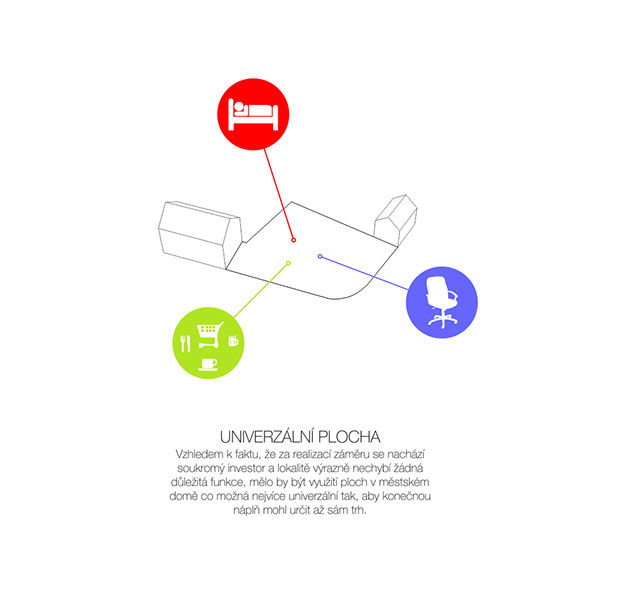 Navrhovaný objekt nemá za cíl vytvářet v lokalitě novou dominantu, avšak má pouze svou hmotou doplnit a vyvážit celkovou kompozici území.