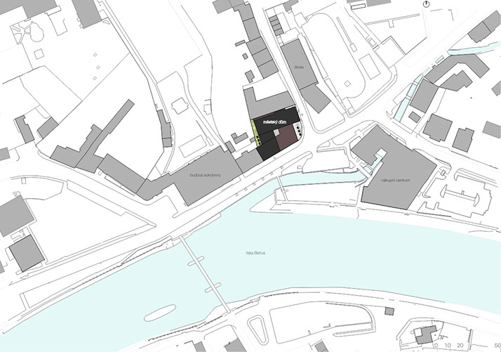 Navržený dům reaguje na urbánní souvislosti v území a dotváří tak v současné době rozbitý blok budov na nábřeží s dominantní hmotou budovy sokola. Řešený objekt navazuje na zajímavé řešení vstupu sokolovny uskočením hmoty domu od uliční čáry. Jednak v úrovni parteru, čímž je vytvořen veřejný předprostor a také úskokem horních pater, jenž vytváří pobytovou zahradu pro obyvatele bytů. Vstupy do objektu jsou orientovány jednak do veřejného předprostoru, tak do nábřeží. Vjezd do autovýtahu pro podzemní garáže je orientován do ulice Malá Dlážka.